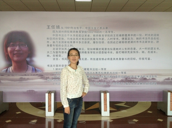 因为书法出众,王任婧在大二期间还被教师教育学院聘为“三笔字小先生”,承担着大一三个班每周各一节的书法教学课。“在我们专业像我一样从小学习书法的同学很少,使得我在专业课书法练习上占有很大的优势。我也很高兴能有这样的机会,与学弟学妹们交流书法练习的心得。” 王任婧说。