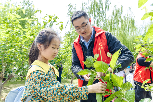 在桑叶采摘体验区,春蚕饲养劳动教育的学生志愿者们亲自示范,手把手教导家长和孩子们正确的采摘桑叶方式,并普及蚕宝宝食用桑叶的特殊要求,以及不同龄期的蚕宝宝对桑叶成熟度的不同需求等知识。